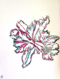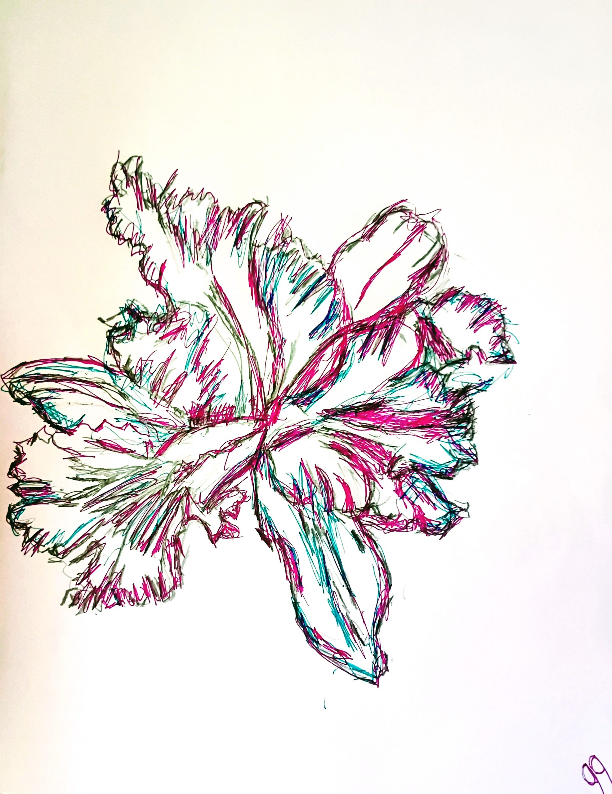 This is an original 9 by 12 colored ink ark pen of Orchid Purple & Teal done from gg