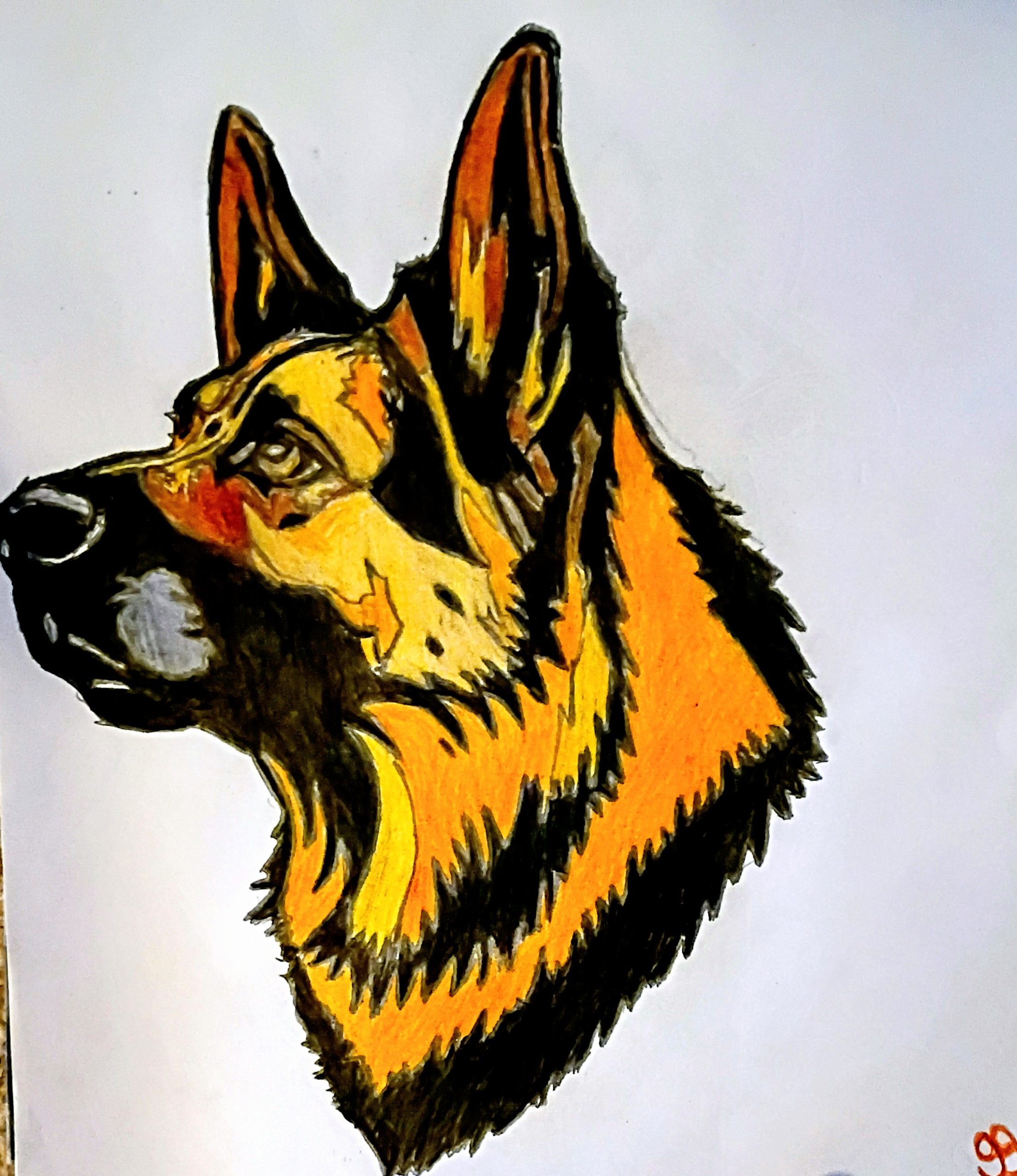 This is an original 9 by 11 colored pencil of a cure adorable Smiling Moonlight colored German Shepherd done from gg
