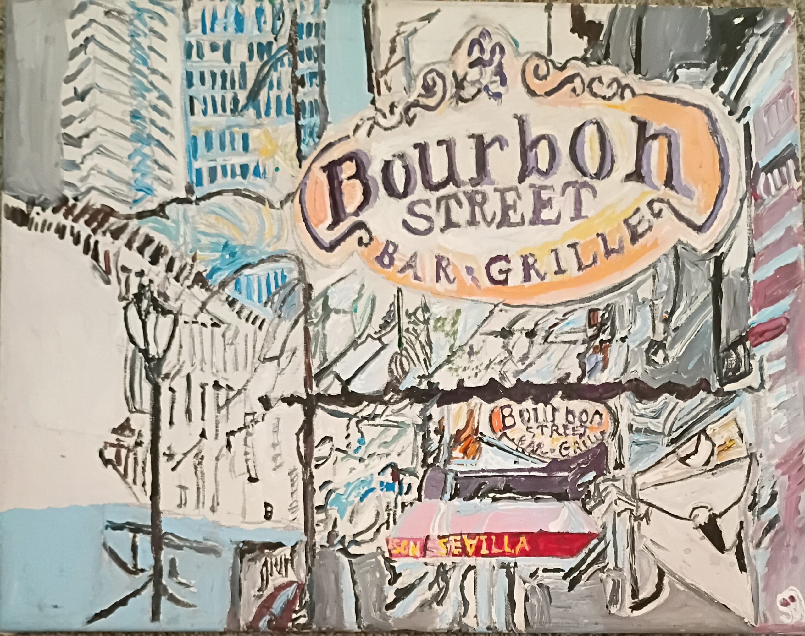 This is an original 16 by 20 canvas painting of famous downtown New Orleans Bourbon Street done from gg