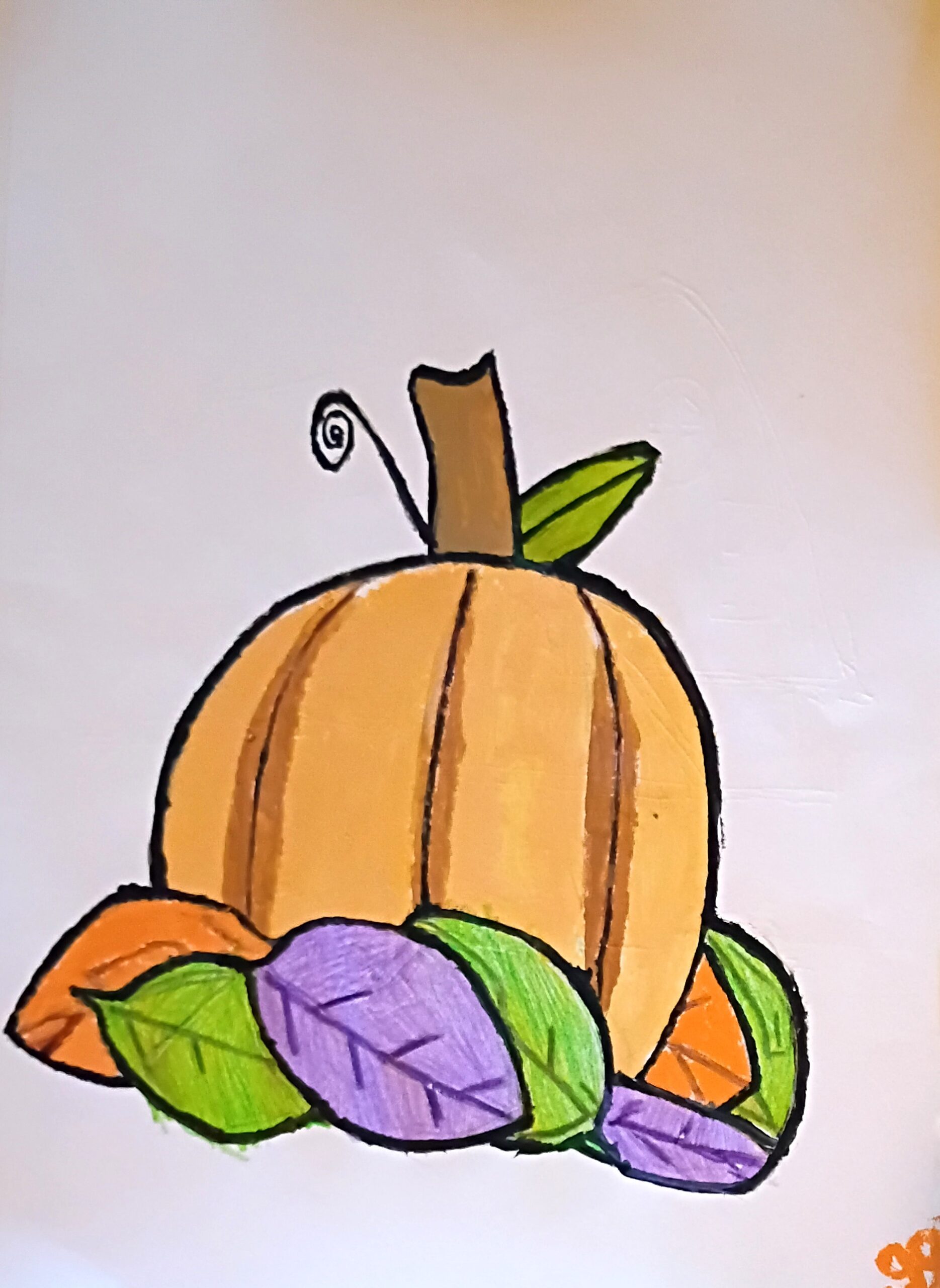This is an original 9 by 12 colored pencil and paint of a Autumn October Pumpkin with leaves done from gg