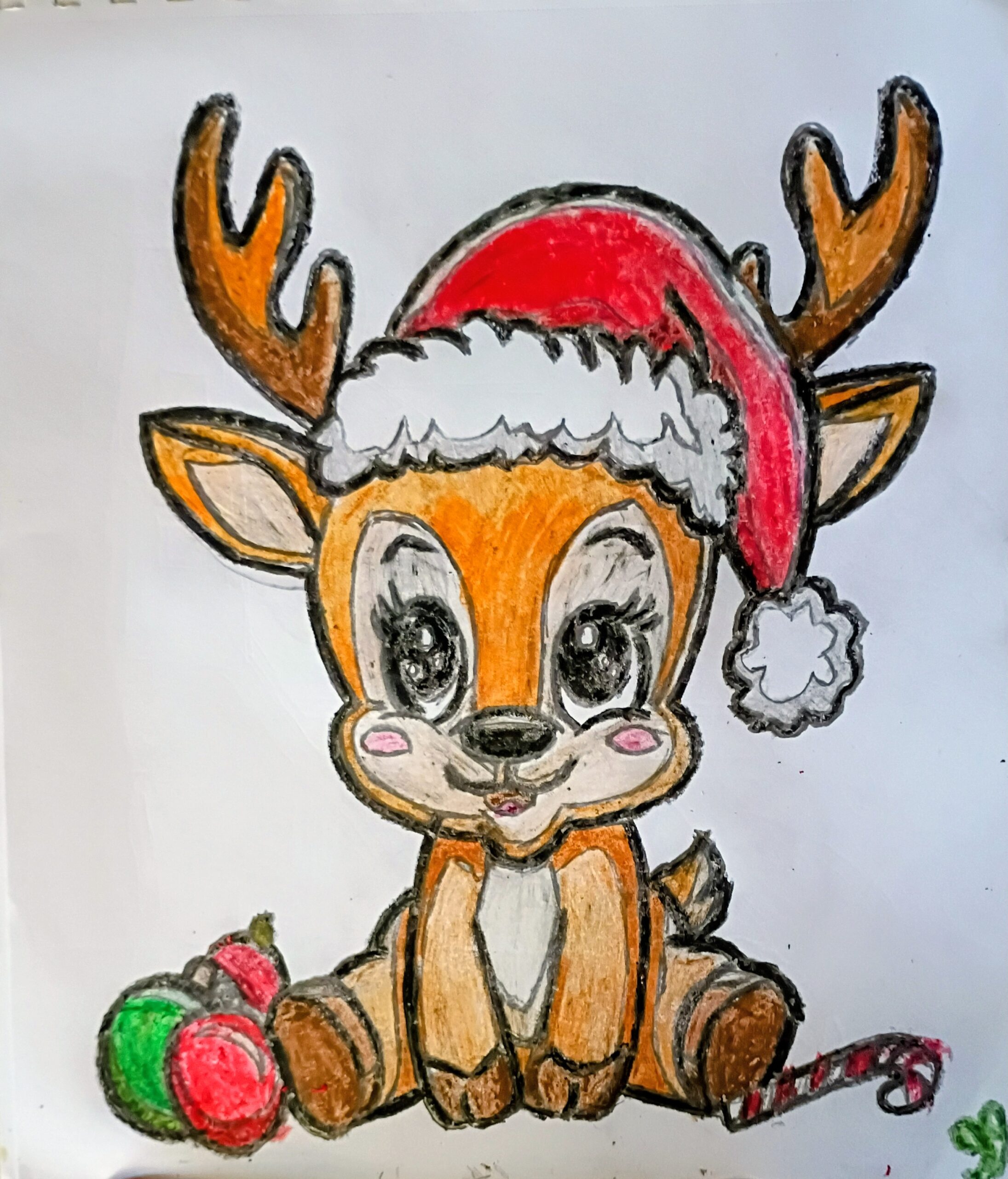 This is an original 9 by 11 crayon of smiling praising Jesus cute female reindeer in Christmas New Year grafe done from gg