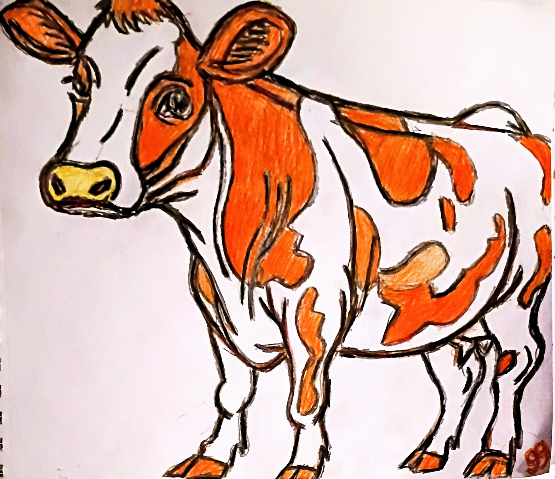 This is an original 9 by 11 colored pencil of a adorable cute smiling Cow praising Jesus for his grateful sins and finding a warm spot out of cold done from gg