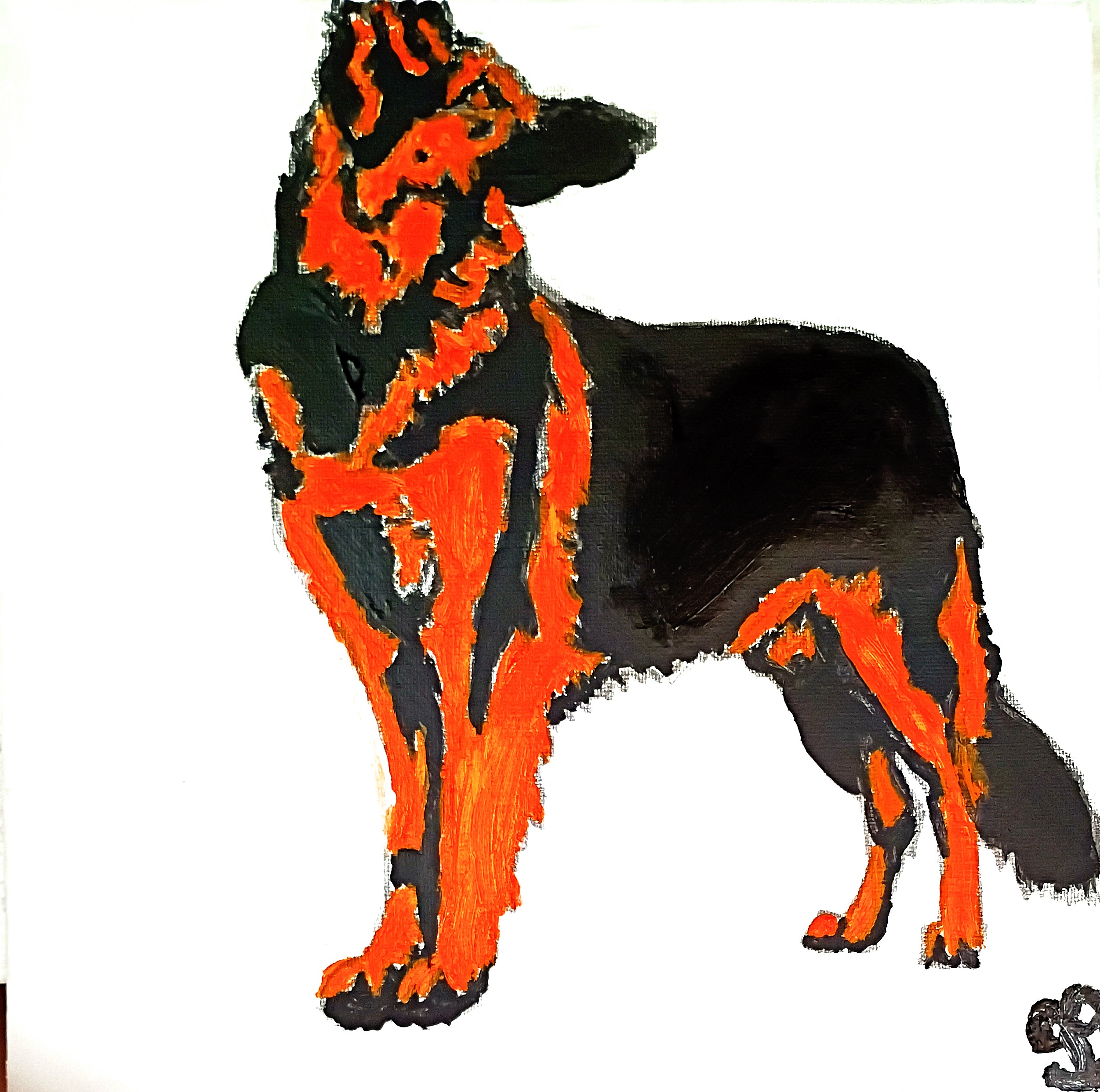 This an original 4 by 4 canvas painting of adorable cute black and dark Terra Cotta German Shepard done from gg