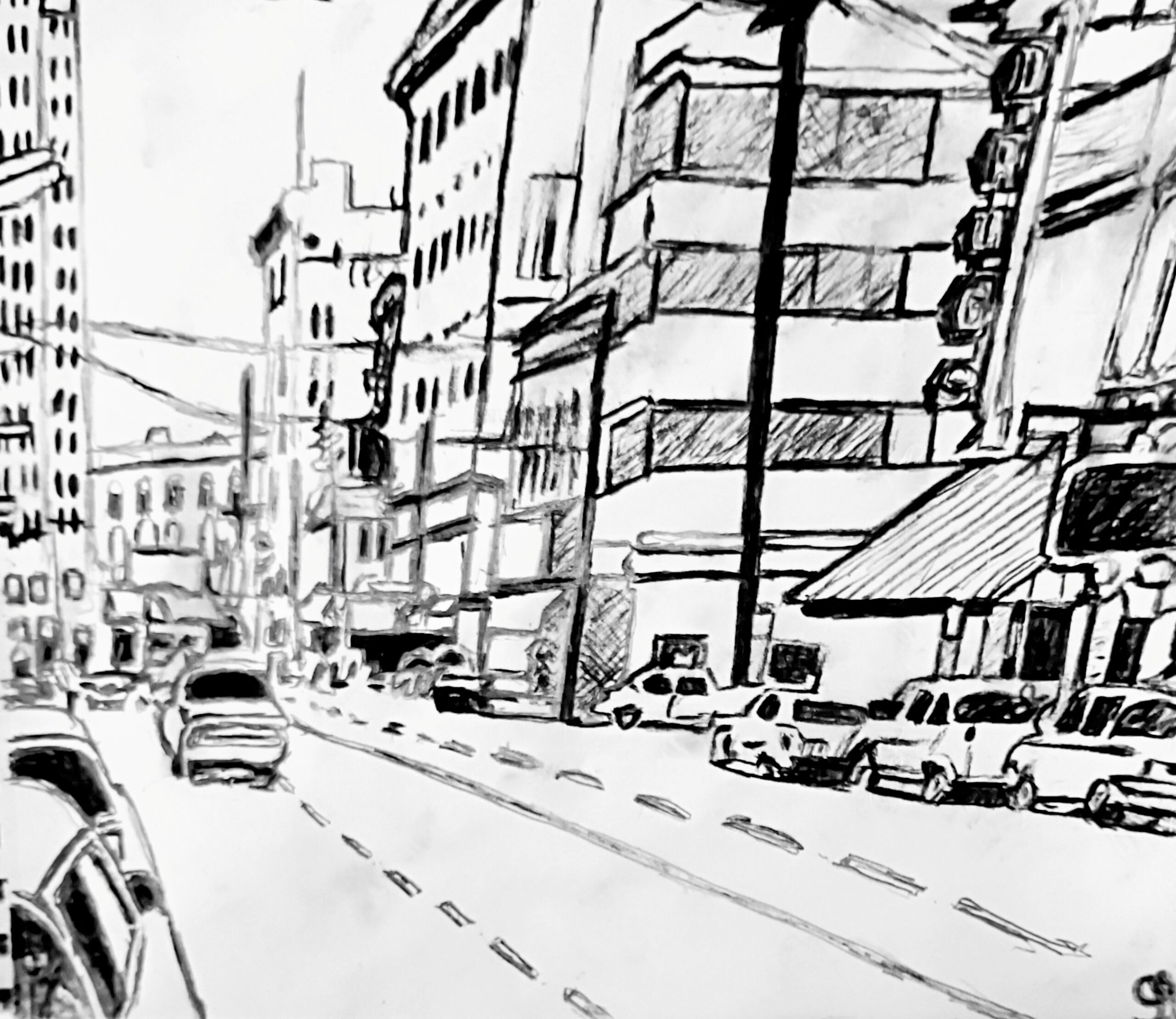 This is an original 9 by 11 black and white charcoal of downtown Meridian, Mississippi back in day done from gg