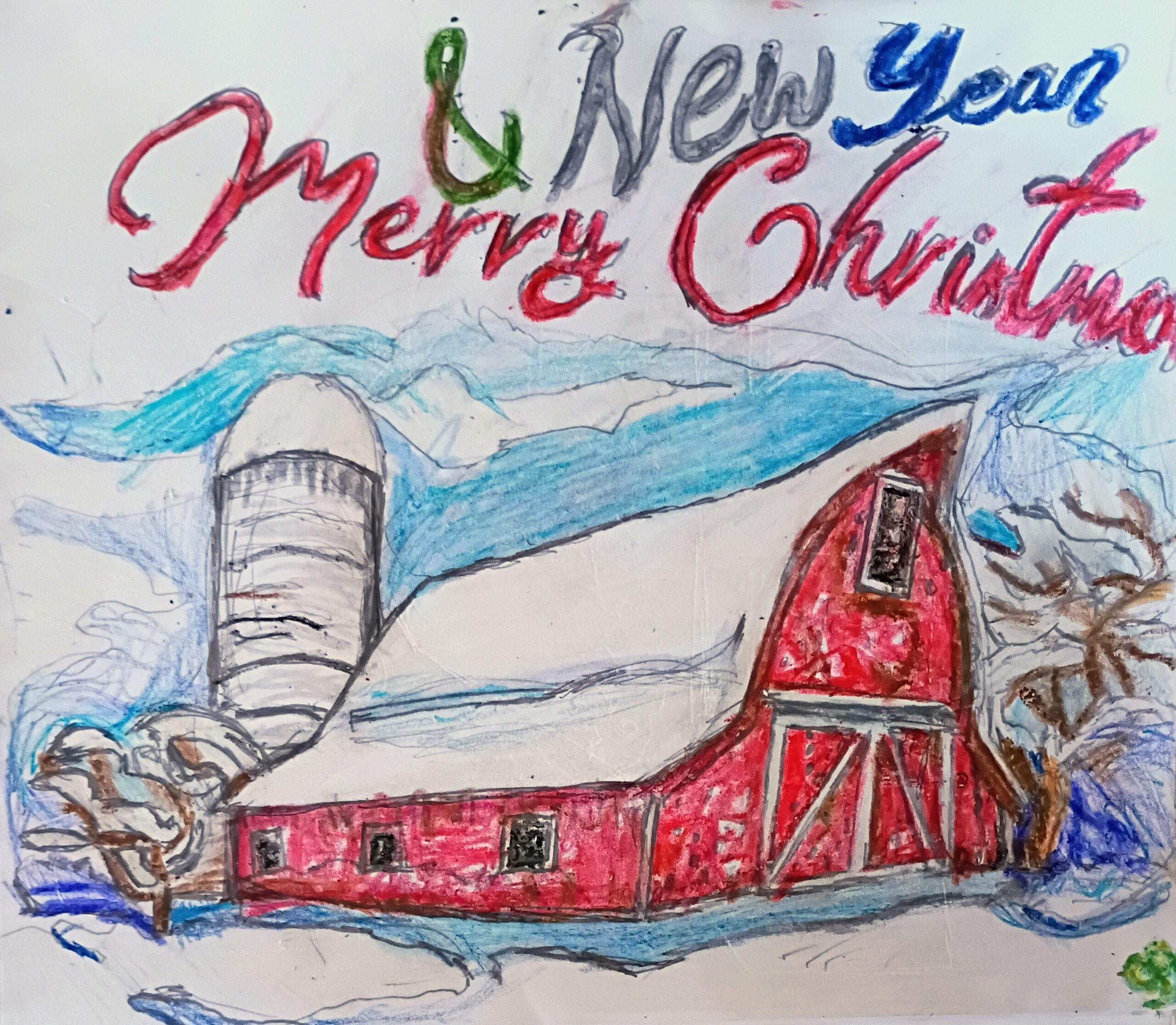 This is an original 9 by 11 crayon of Christmas New Year Country Barn in Flagstaff decorated with trees and snow done from gg