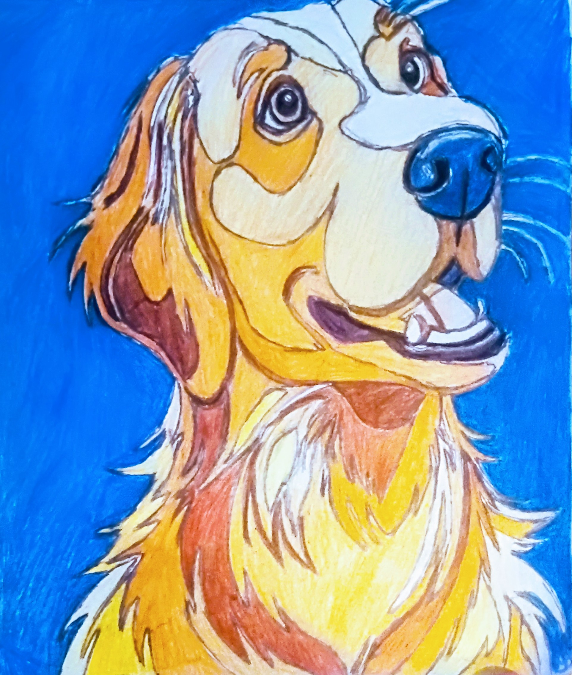 This is an original 9 by 11 colored pencil of cute Golden Retriever praising Jesus for a silent winter deep blue evening sky done from gg