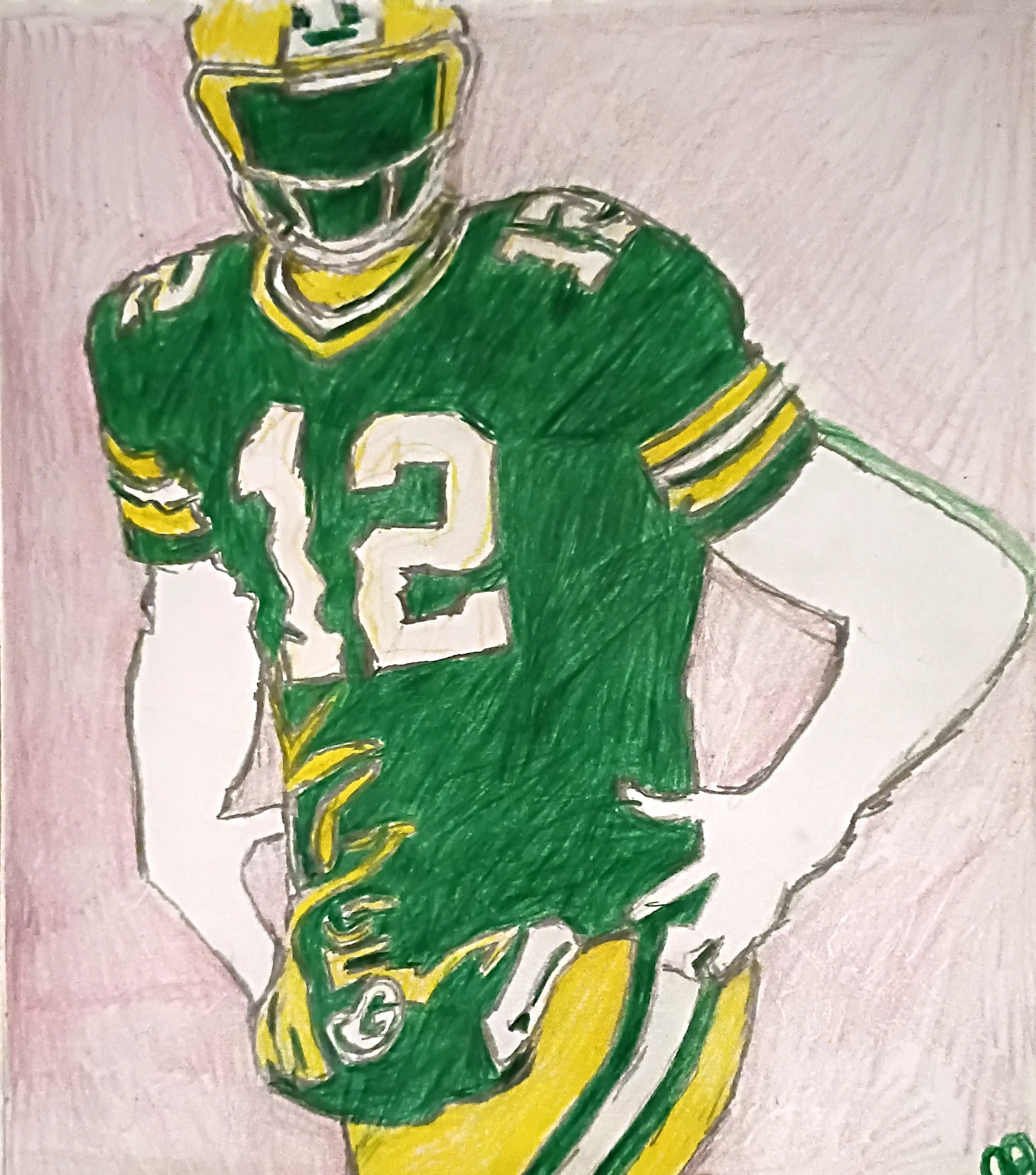 This is an original 9 by 11 colored pencil of famous recent Green Bay Packers Quarterback Aaron Rodgers 2 done from gg