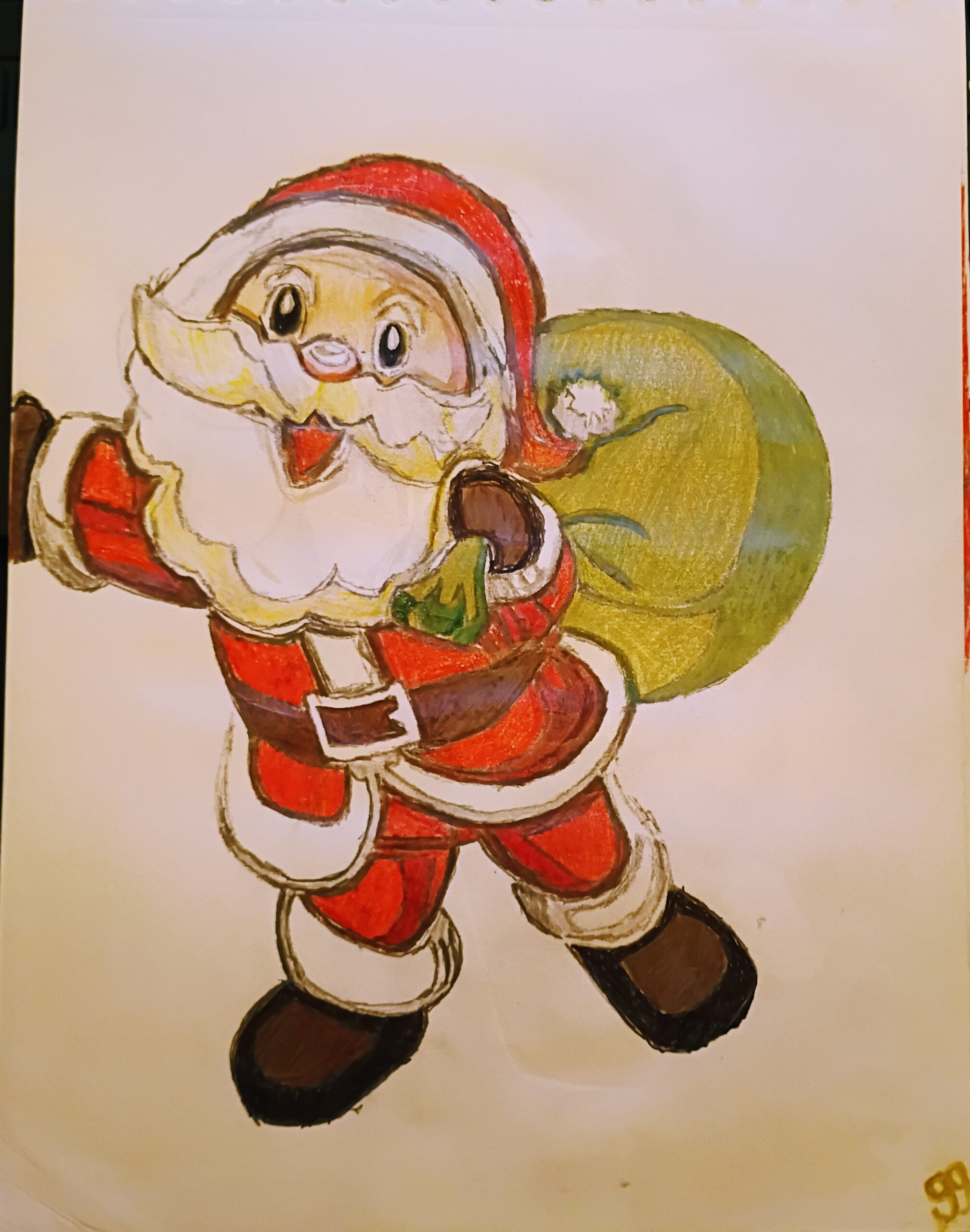 This is an original 9 by 12 colored pencil of Christmas New Year Holiday celebrating of Santa Claus doing his Job praising our sins done from gg