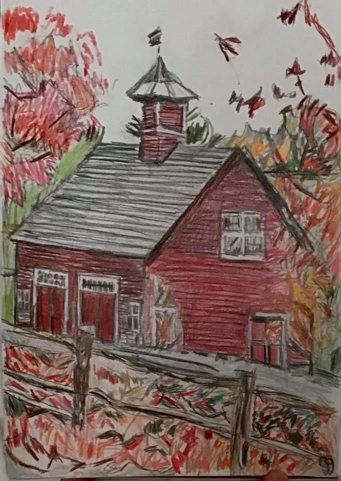 This is an original 9 by 12 colored pencil of old Country Autumn Cabin Scene with Maple Trees & Fence done from gg