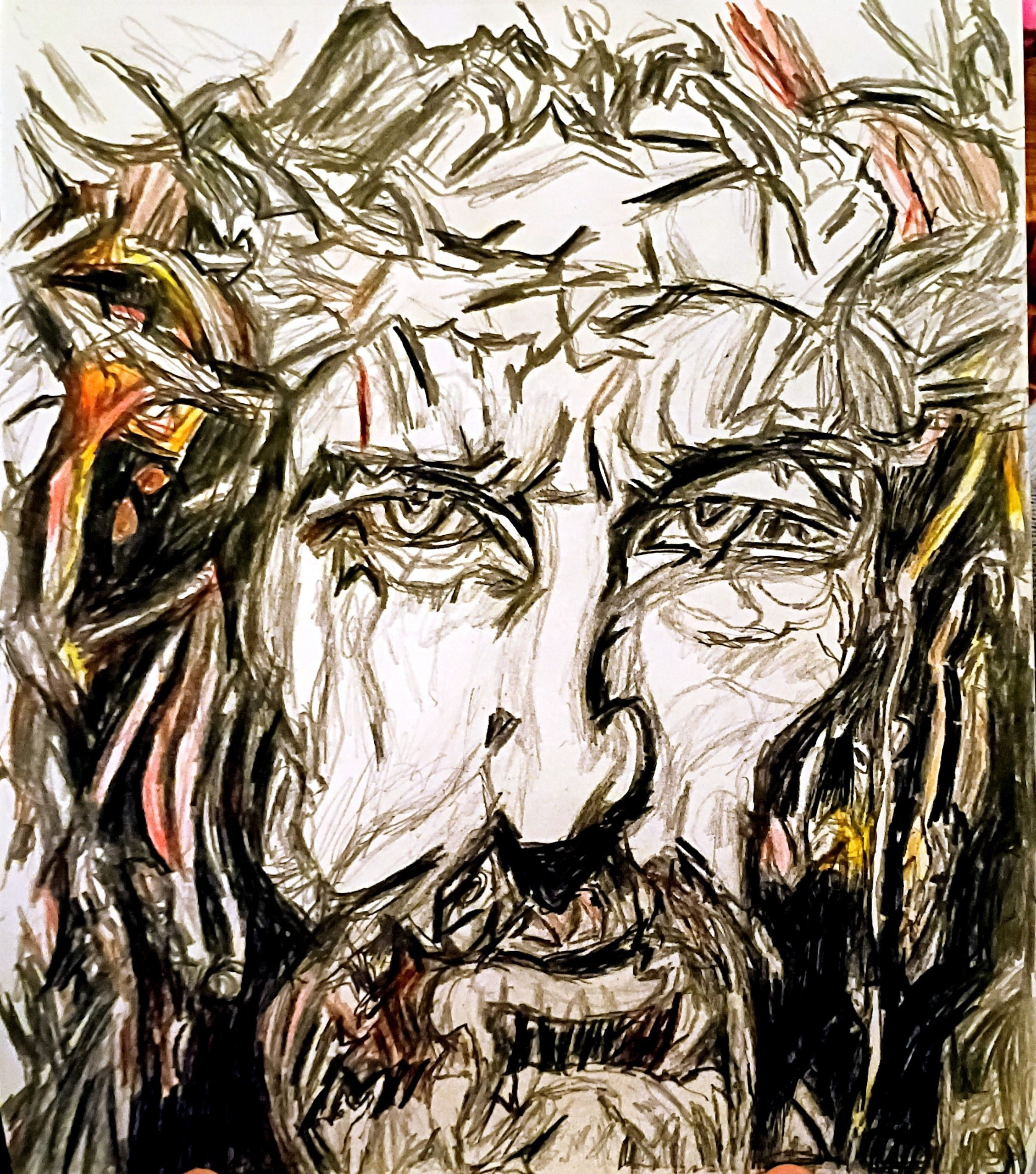 This is an original 9 by 11 colored pencil of grateful Jesus Praising for our sins and remembering the real reason why we have a roof over our heads done from gg