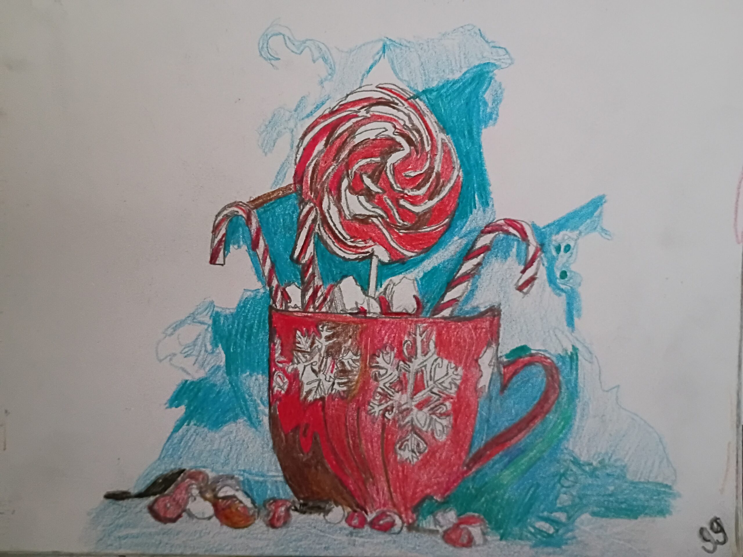 This is an original 9 by 12 colored pencil of a celebration of Christmas New Year Praising Jesus for our sins done from gg