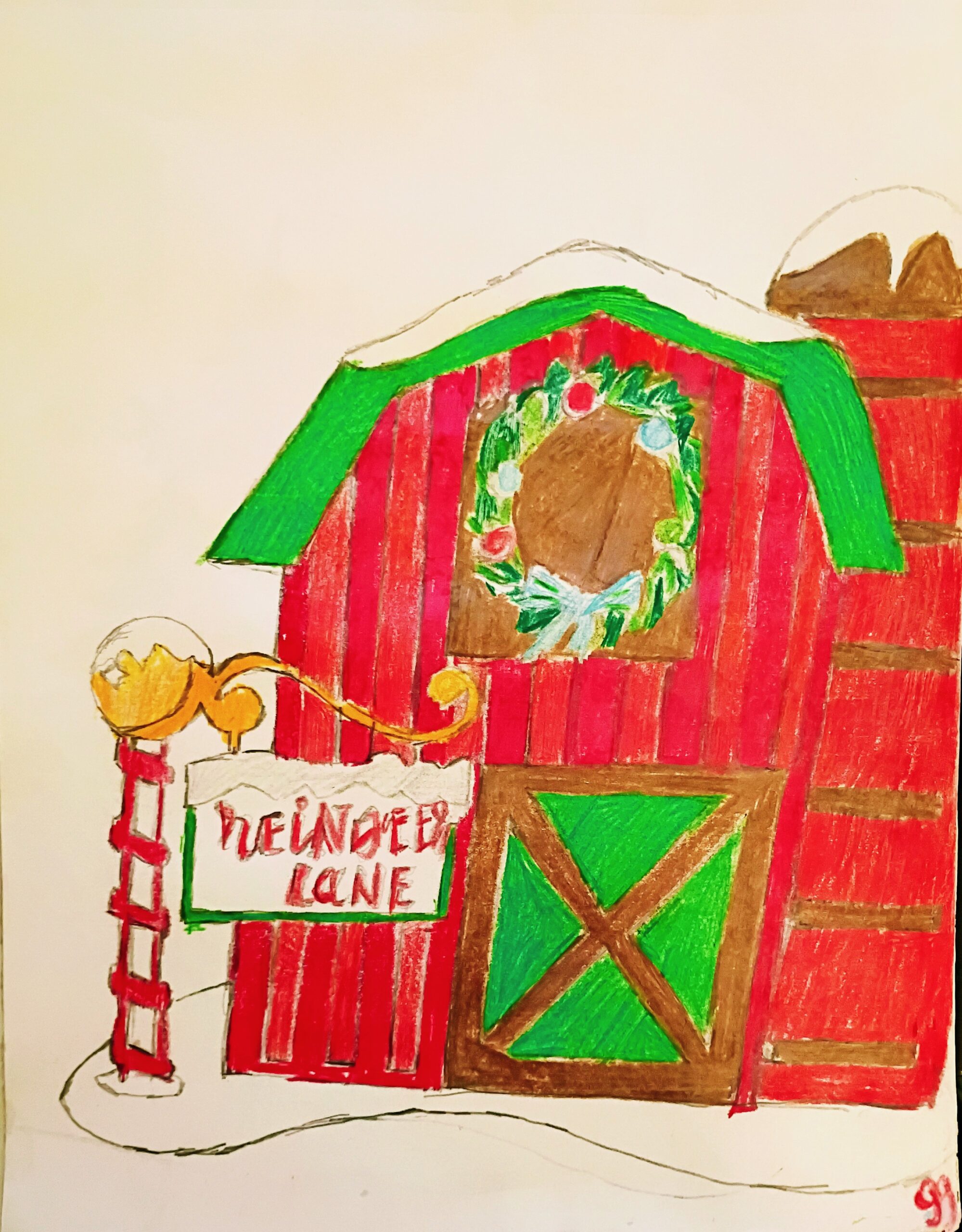 This is an original 9 by 12 colored pencil of holiday Christmas New Year Reindeer Ln in North Pole remembering true reason for the season of sweet Jesus in old winter country barn cabin done from gg